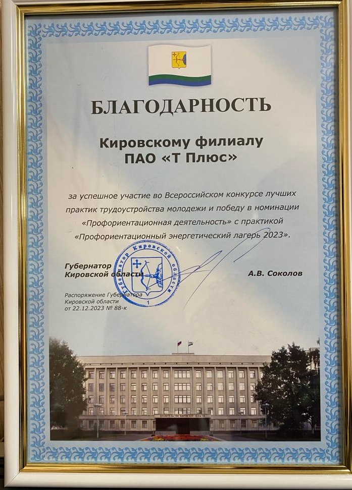 Кировский филиал ПАО "Т Плюс" занял третье место на Всероссийском конкурсе лучших практик трудоустройства молодежи в номинации "Профориентационная деятельность" с проектом летнего профориентационного энергетического лагеря для детей сотрудников.