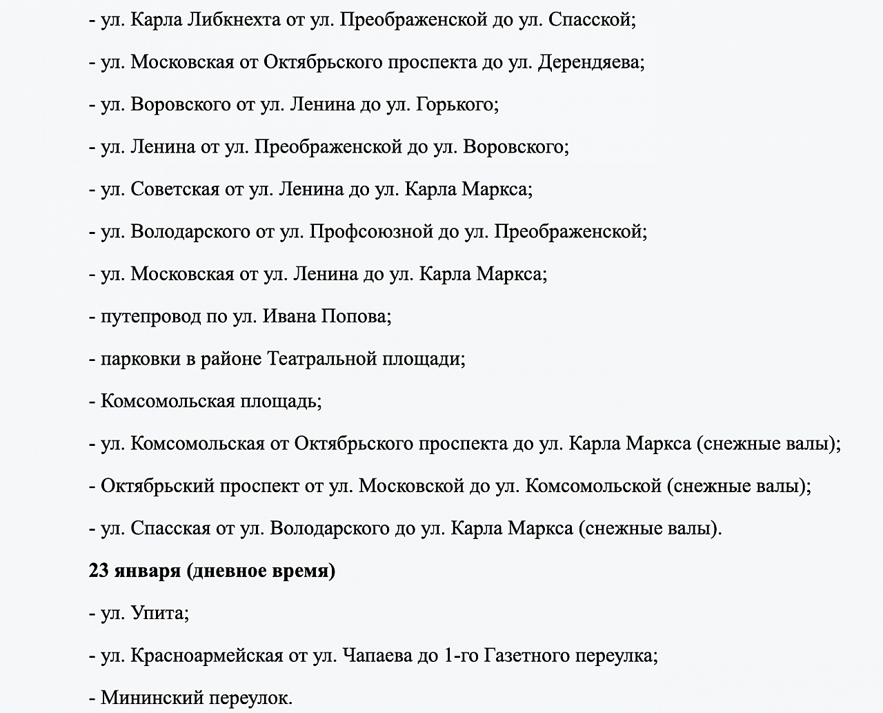 На ближайшие сутки 22-23 января сформирован план работы по вывозу снега. Подрядчики готовятся задействовать спецтехнику для очистки следующих участков дорог: