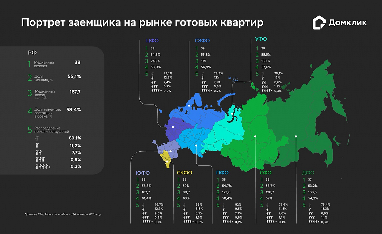 Согласно полученным данным, медианный возраст заемщика составил 38 лет, более половины (55%) всех ипотечных кредитов на "вторичку" были выданы женщинам. Также отмечается, что 58% заемщиков состоят в официальном браке, у 82% нет детей. За год эти характеристики изменились слабо.