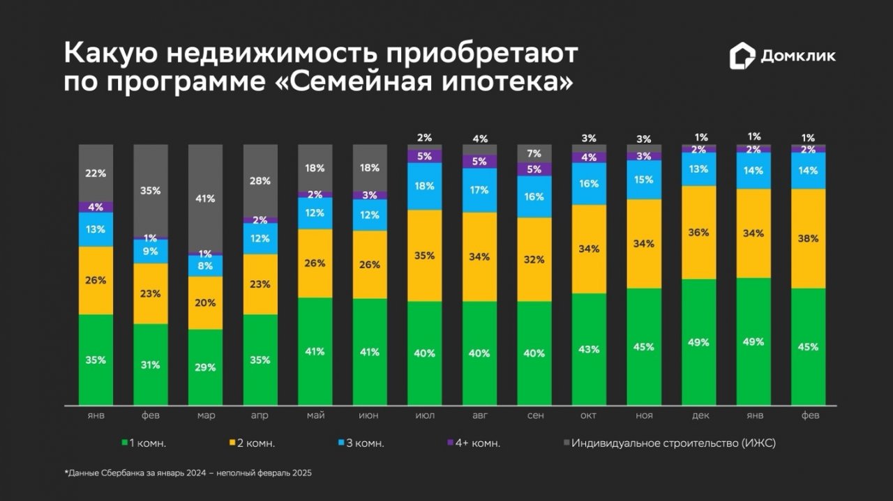 По данным на начало 2025 года, внимание заемщиков по "Семейной ипотеке" все еще обращено на рынок квартир: доля ИЖС пока остается скромной. -
