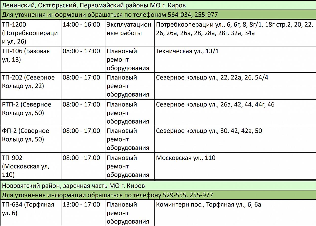 Списки адресов, которые будут отключены, доступны на сайте организации. Ниже представлен график отключений.