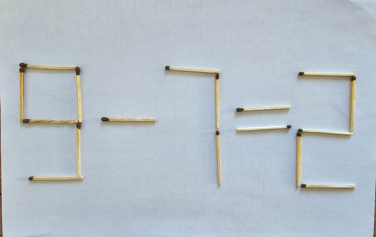 Ваша задача — изменить положение определённых спичек так, чтобы уравнение стало правильным. Необходимо использовать только 2 спички и сделать это так, чтобы уравнение 6 - 7 = 2 стало верным.
