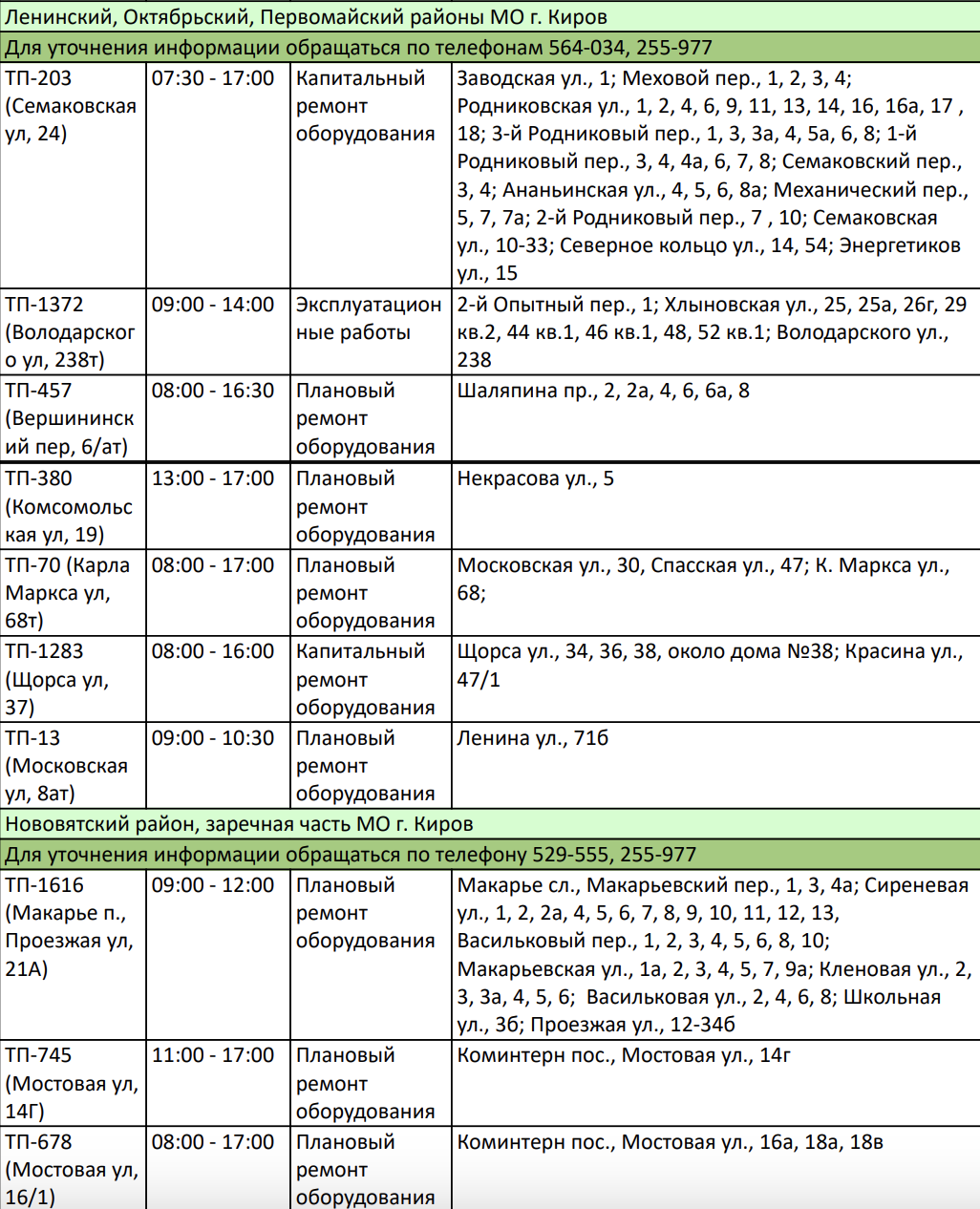 В результате некоторые жители Ленинского, Первомайского, Октябрьского, Нововятского районов и заречной части города останутся без электричества. График проведения работ представлен ниже.