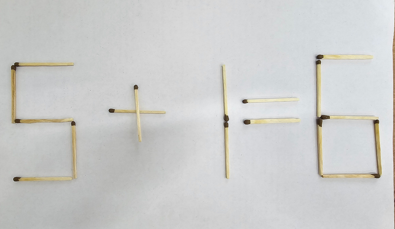 Разгадка: переместите одну спичку из числа "7", превратив его в "1", чтобы получилось "5+1=6". Это демонстрирует, что порой необходимо взглянуть на проблему под другим углом, чтобы найти верный путь.