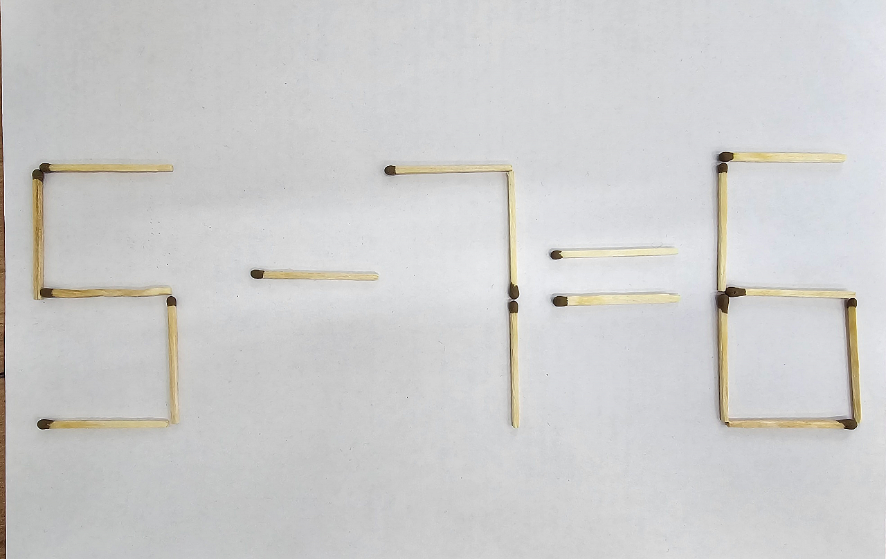 Приглашаем вас к захватывающей головоломке со спичками, которая станет настоящим испытанием для вашего интеллекта и творческого подхода! Ваша цель – привести в порядок некорректное равенство: "5-7=6".