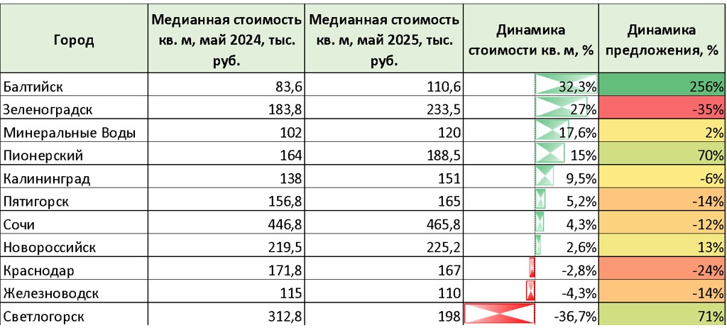 За период с мая 2024 по май 2025 года первичный рынок недвижимости в курортных городах продемонстрировал значительный рост цен в большинстве локаций. Наибольший рост цен отмечен в прибрежных курортных городах Калининградской области. Так, в Балтийске цены на новостройки за год выросли почти на треть (+32,3%, с 83,6 до 110 тыс. руб./кв. м). На втором месте – Зеленоградск (+27%, до 233,5 тыс. руб./ кв. м). Тройку замыкают Минеральные Воды (Ставропольский край) – там рост цен составил 17,6%, до 120 тыс. за кв. м.