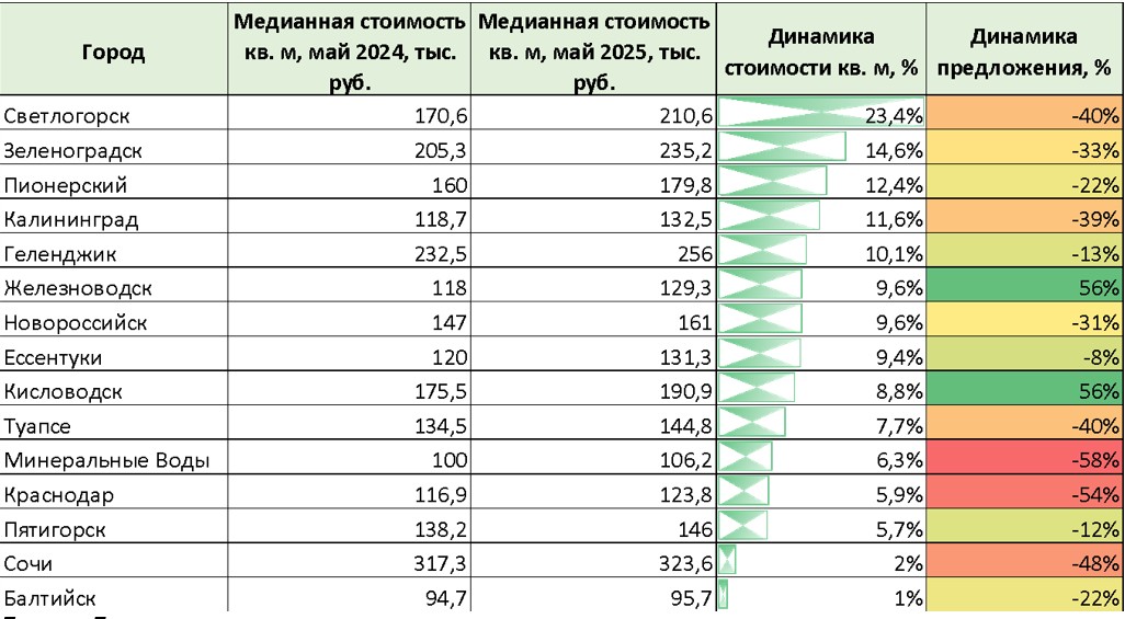 Снижение цен зафиксировано в Краснодаре (-2,8%), Железноводске (-4,3%) и особенно резко в Светлогорске (-36,7%, с 312,8 до 197,9 тыс. руб./ кв. м).