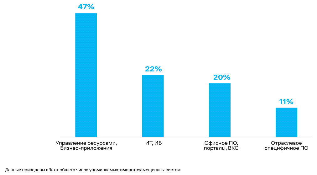 Импортозамещение отнюдь не выступает приоритетным направлением для отрасли: фактический уровень замещения варьируется от класса ПО: 47% в управлении ресурсами и бизнес-приложениях, 22% — в сфере ИТ и ИБ, 20% — в офисном и коммуникационном ПО, и лишь 11% — в специфичном отраслевом. Замещаются только те системы, использование которых стало невозможным или сопряжено с серьезными рисками.