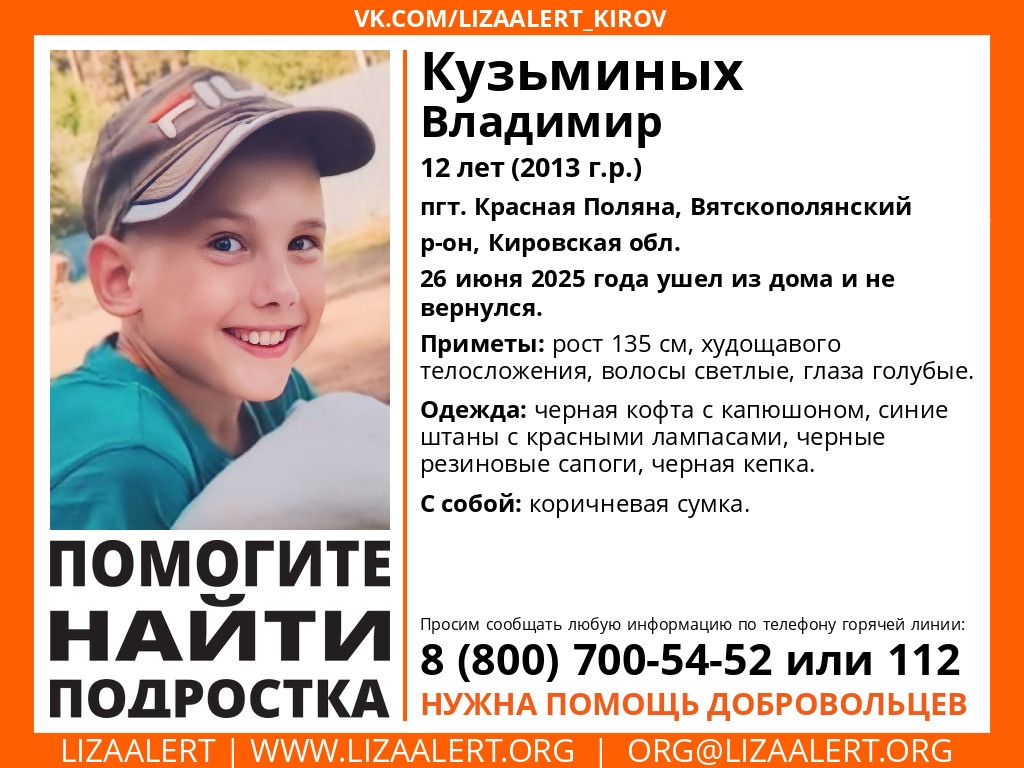 В поселке Красная Поляна Вятскополянского района пропал 12-летний Владимир Кузьминых. По информации, полученной от его близких, мальчик ушел из дома 26 июня 2025 года и не вернулся.