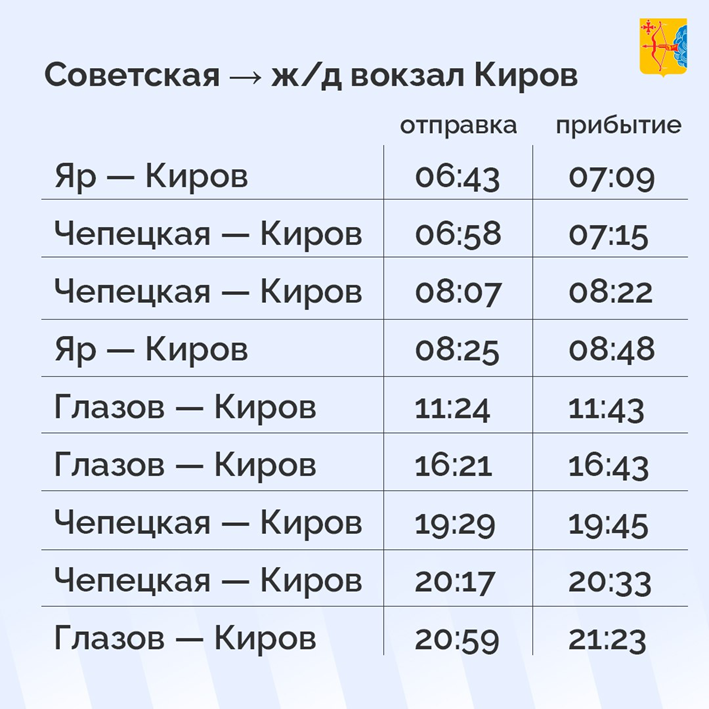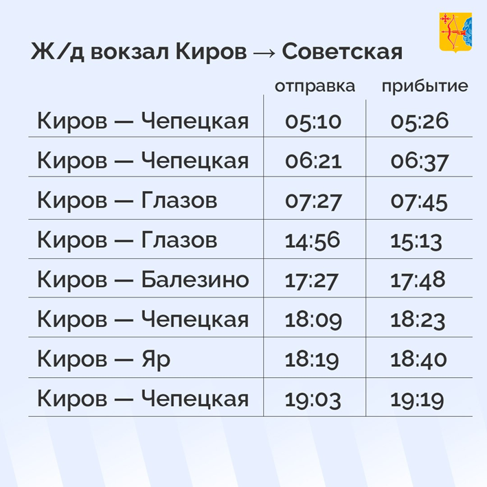 С понедельника, 21 июля, частота курсирования поездов в утренние и вечерние часы пик на участке Советская – Киров увеличивается до двух раз в час. Учитывая стоимость билета в 34 рубля, это делает маршрут удобным для горожан, – добавил Леонид Тихонов, начальник пассажирской службы Волго-Вятской пригородной пассажирской компании.