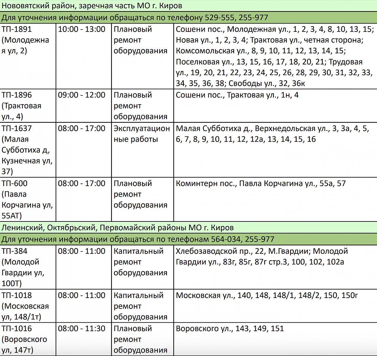 В различных районах города будут проводиться работы, которые могут вызвать временные неудобства для местных жителей. Работы будут проводиться с 8:00 до 17:00. В Ленинском, Первомайском, Октябрьском, Нововятском районах и в заречной части города некоторые дома будут временно обесточены.