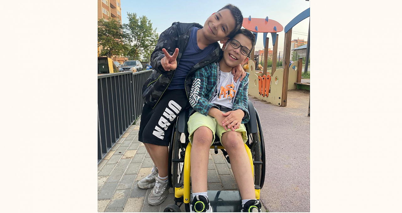 Дима — правая рука Саши. Он помогал ему одеваться и раздеваться. Сейчас Дима возит старшего брата на коляске, а на детской площадке объясняет детям, что близнец плохо ходит. Кстати, старший сын заговорил раньше Димы. Это было в два года и три месяца на курсе реабилитации.