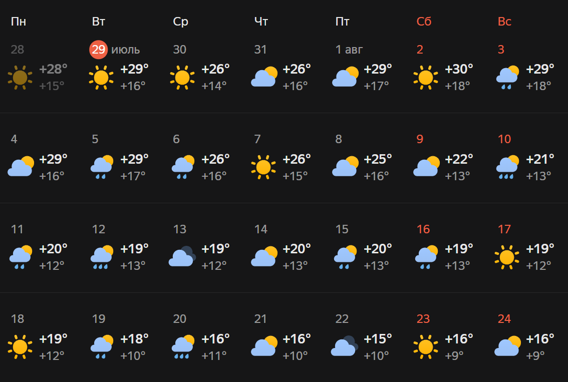 Такая температура продержится до 7 августа. Самым жарким днем обещает стать суббота, 2 августа, когда температура поднимется до 30 градусов. Также жаркими будут 1, 3 и 5 августа с температурой до 29 градусов. Однако по ночам температура будет значительно ниже — от 14 до 18 градусов.