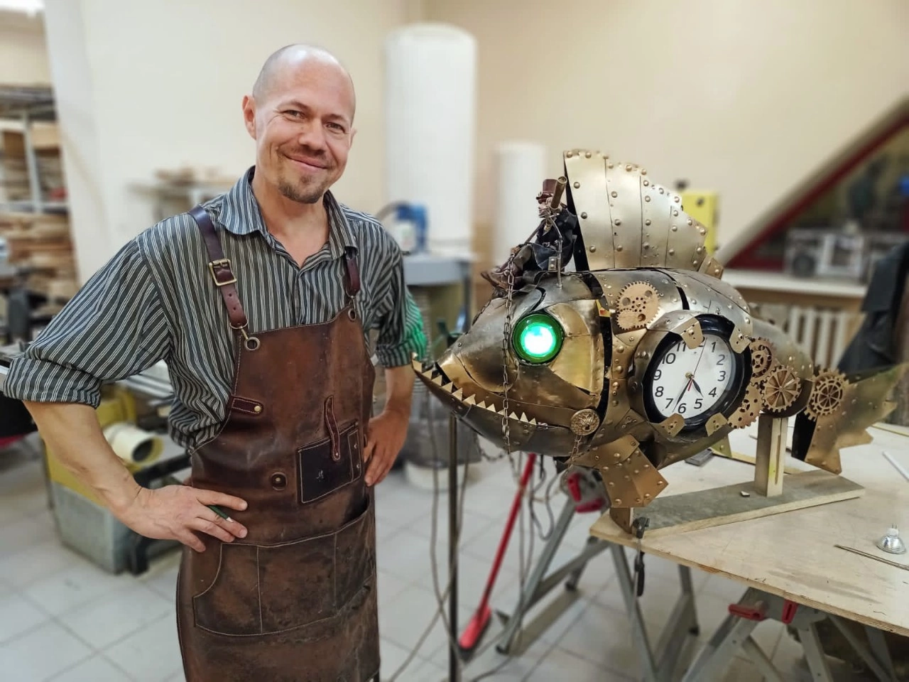 Работал дома на коленках. В ход шло все: детали старых видеомагнитофонов и часов, листовая медь, дерево, пластик. По итогу, получился гибрид подводной лодки и летающего корабля с подвижными крыльями-плавниками и рулем в форме хвоста. Арт-объект находится и сейчас в столярной мастерской. Он был первым механическим изделием.