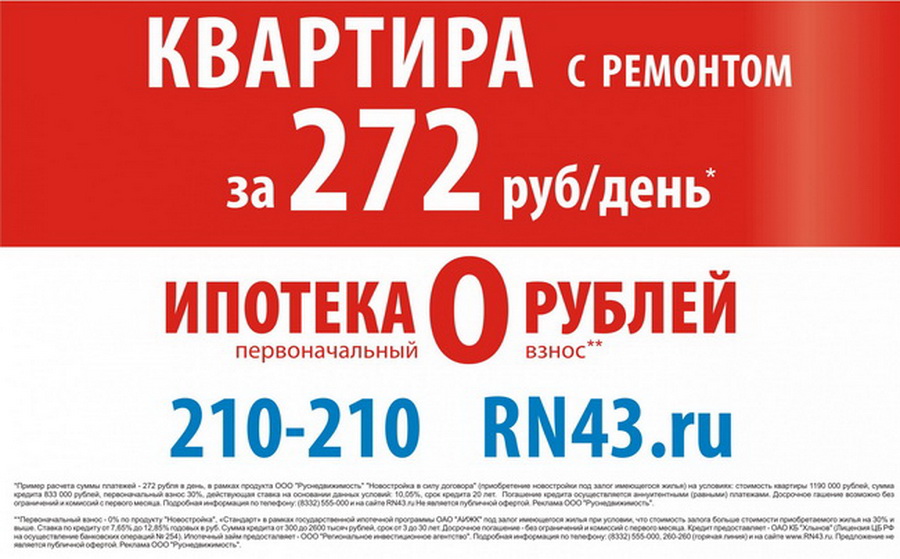 *Первоначальный взнос - 0% по продукту "Новостройка", «Стандарт» в рамках государственной ипотечной программы ОАО "АИЖК" под залог имеющегося жилья при условии, что стоимость залога больше стоимости приобретаемого жилья на 30% и выше. Ставка по кредиту от 7,65% до 12,85% годовых в руб. Сумма кредита от 300 до 2600 тысяч рублей, срок от 3 до 30 лет. Досрочное погашение - без ограничений и комиссий с первого месяца. Кредит предоставляет - ОАО КБ "Хлынов" (Лицензия ЦБ РФ на осуществление банковских операций № 254). Ипотечный займ предосталвяет - ООО "Региональное инвестиционное агентство". Подробная информация по телефону: (8332) 555-000, 260-260 (горячая линия) и на сайте www.RN43.ru. Предложение не является публичной офертой. Реклама ООО "Руснедвижимость".