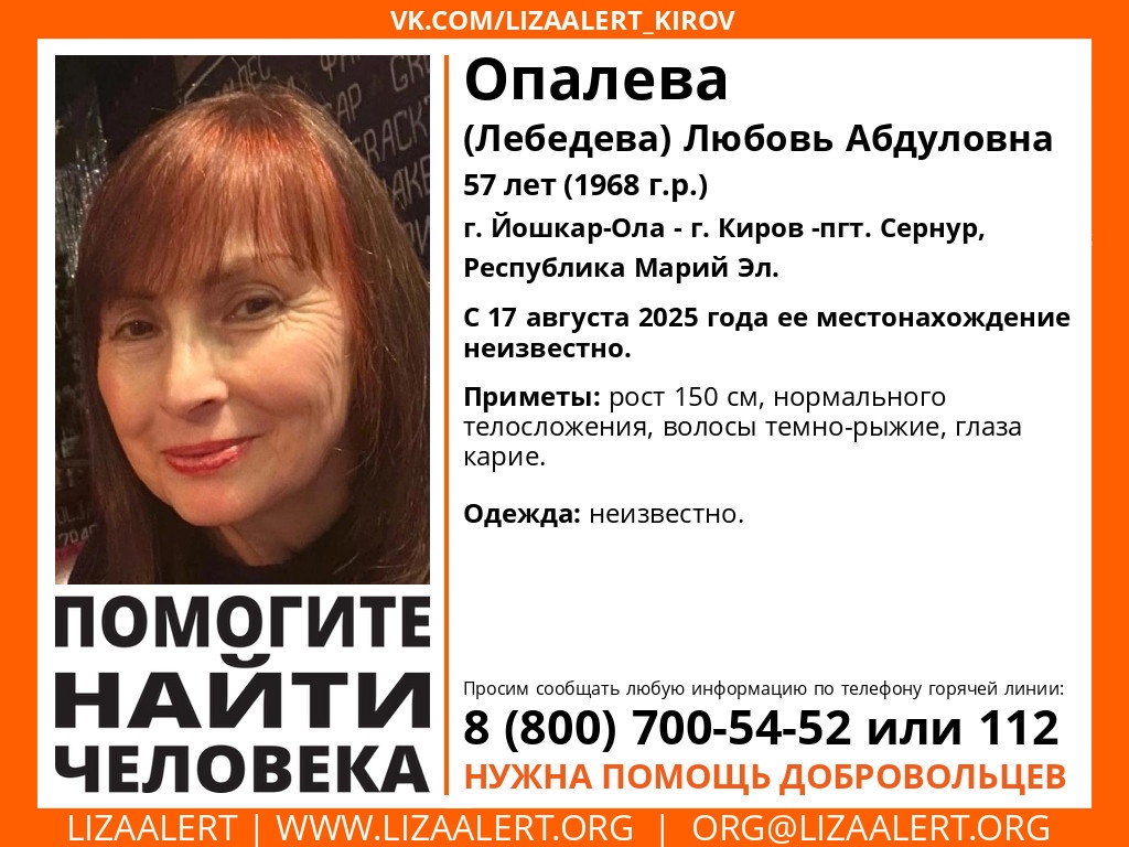 Волонтерские организации активно распространяют информацию о пропаже Любови Абдуловны Опалевой (Лебедевой), призывая всех жителей Кировской области, обладающих какой-либо информацией о ее возможном местонахождении, немедленно сообщить ее поисковикам или в правоохранительные органы.