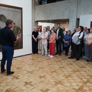 В Вятском художественном музее прошла особая экскурсия по выставке "Грековцы. Под знаменем Победы" (6+), пишет пресс-центр Правительства Кировской области. Мероприятие провели не искусствоведы, а участники XX Всероссийского Васнецовского пленэра — Валерий Мокрушин, Василий Кукурса и Сергей Трошин. Художники рассказали гостям о ключевых моментах военной истории России, знаменитых битвах и образах военачальников, которых запечатлели на полотнах.