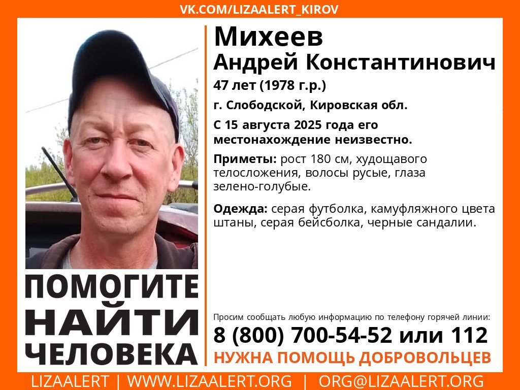 В городе Слободской Кировской области разыскивается 47-летний Андрей Константинович Михеев. Об этом сообщили в паблике поискового отряда "ЛизаАлерт" по региону.