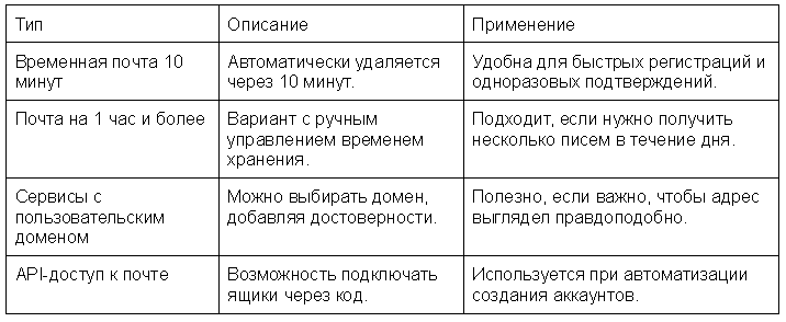 Для массового запуска или автотеста часто применяются сервисы с API и поддержкой webhook — они позволяют интегрировать создание почты прямо в пайплайн запуска.