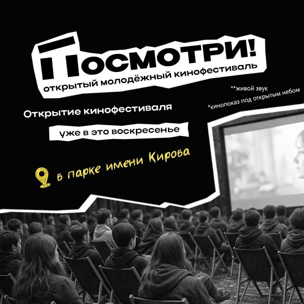 7 сентября в 19:00 в парке имени Кирова у памп-трека пройдет открытый молодежный кинофестиваль "Посмотри!" (12+). В этом году событие впервые обрело всероссийский масштаб, привлекая участников и гостей не только из Кирова, но и других регионов страны.