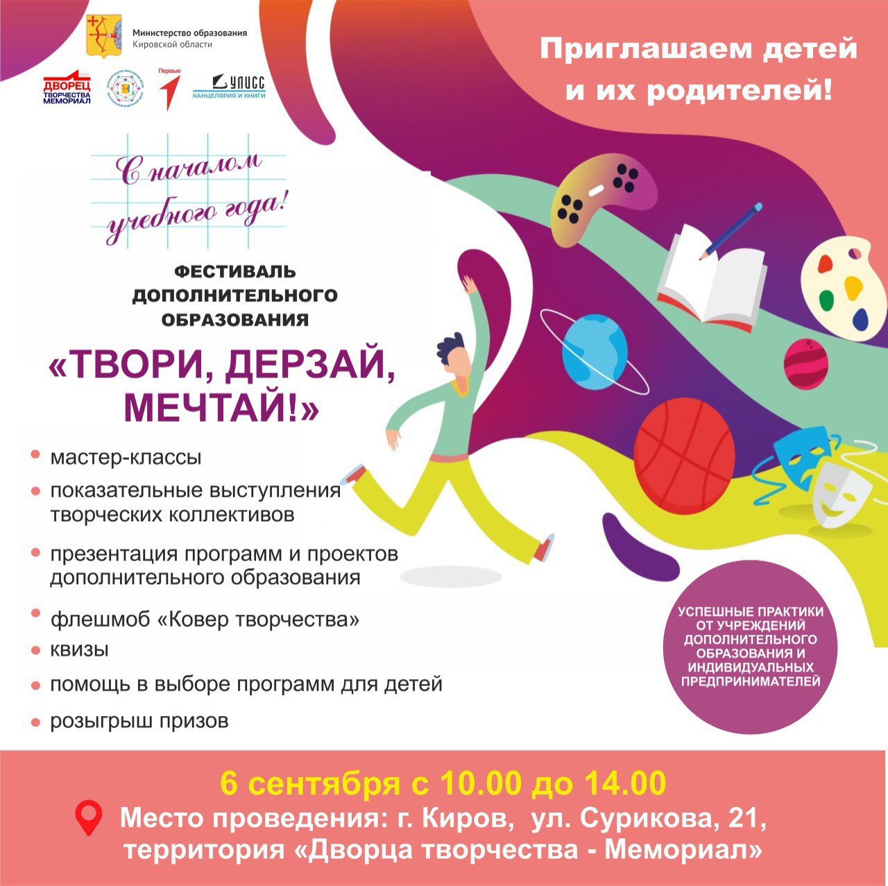 6 сентября в Дворце творчества – Мемориал состоится фестиваль дополнительного образования "Твори, дерзай, мечтай!". На этом мероприятии дети и их родители смогут ознакомиться с разнообразными творческими направлениями и открыть в себе новые таланты. Участникам будет предложено выбрать занятие по душе, а также познакомиться с учреждениями дополнительного образования Кировской области.
