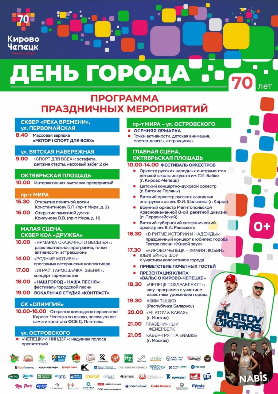 В 16:30 начнется праздничный концерт к юбилею города "В ритме истории и надежды" от Театра песни "Живой звук" (0+). В 17:30 стартует главное событие дня — юбилейное шоу "Кирово-Чепецк — Химия любви!" с участием коллективов города, приветствием почетных гостей и презентацией клипа "Вальс о Кирово-Чепецке2 (12+). В 18:30 зрителей ждет шоу-программа "Чепецк поздравляют!" с участием известных уроженцев города (12+).