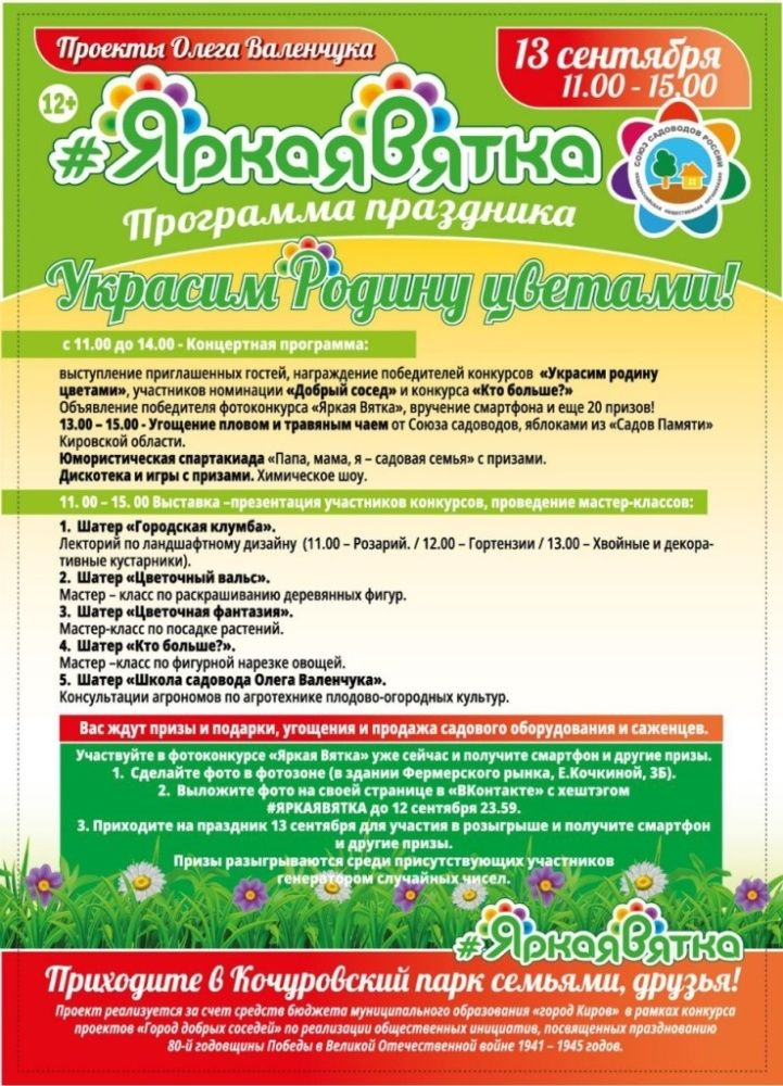 Администрация города приглашает жителей и гостей Кирова провести время в Кочуровском парке 13 сентября с 11:00 до 15:00. В этот день состоится фестиваль "Яркая Вятка".