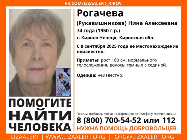 В понедельник, 15 сентября, кировские волонтеры объявили об исчезновении Нины Алексеевны Рогачевой (Рукавишниковой) 1950 года рождения. В последний раз 74-летнюю жительницу города Кирово-Чепецка видели в понедельник, 8 сентября. С тех пор она не выходит на связь.