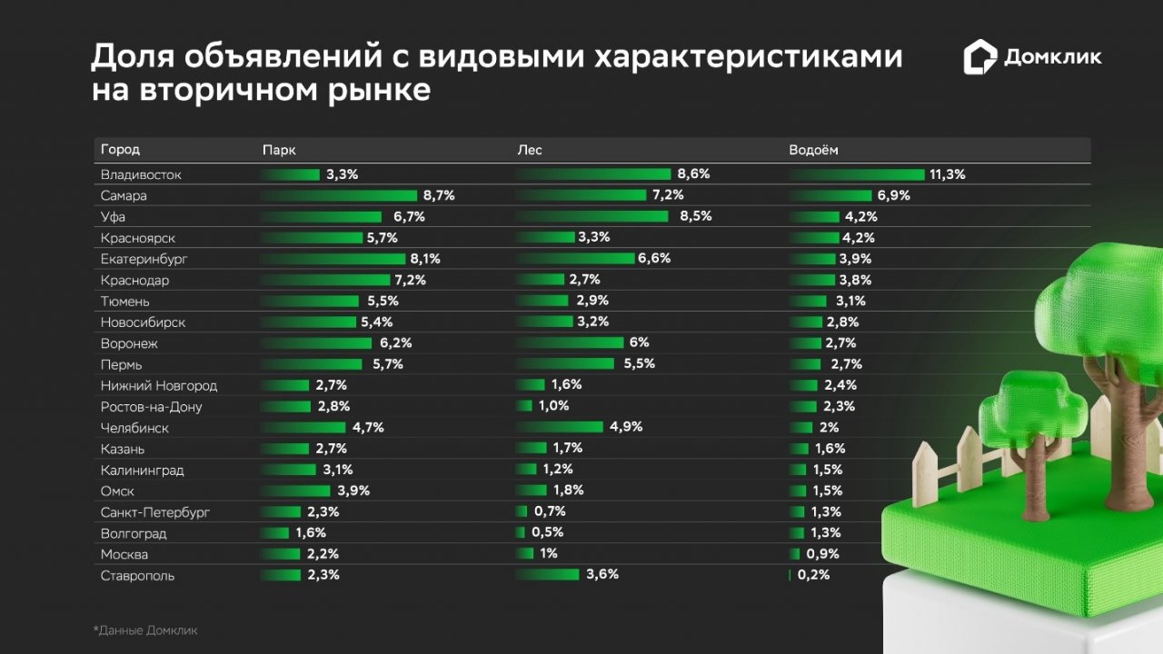 Вид на парки наиболее распространен в Самаре – 8,7% объявлений, Екатеринбурге (8,1%) и Краснодаре (7,2%). В топ-3 городов с окнами на лес входят Владивосток (8,6%), Уфа (8,5%) и Самара (7,2%). Во Владивостоке (11,3%), Самаре (6,9%) и Уфе (4,2%) больше всего квартир с видом на водоемы.