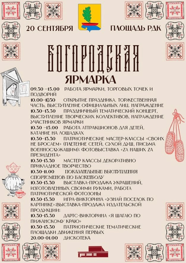 20 сентября на главной площади районного Дома культуры в поселке Пижанка состоится Богородская ярмарка. В 2023 году она приурочена к Году защитника Отечества и 80-летию Победы. Посетители смогут принять участие в мастер-классах по плетению сетей, созданию сухого душа и подготовке писем для военнослужащих. Движение Первых представит фотовыставку "Za наших, Zа Президента" и организует патриотическую фотозону.