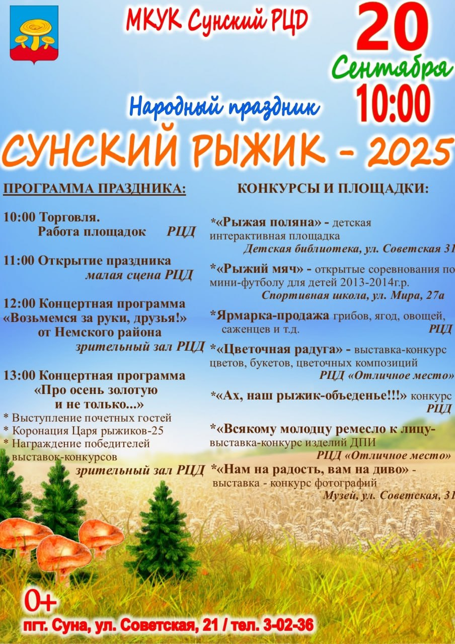 20 сентября в Суне состоится традиционный народный праздник "Сунский рыжик". В 10:00 начнут работать ярмарка и развлекательные площадки.