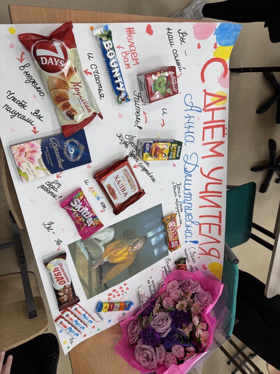 В первый год ребята стеснялись, им было непривычно после начальной школы поздравлять учителя. Но в шестом классе на мой день рождения они по-настоящему заморочились. Парни сделали плакат, а девочки напекли печенья.