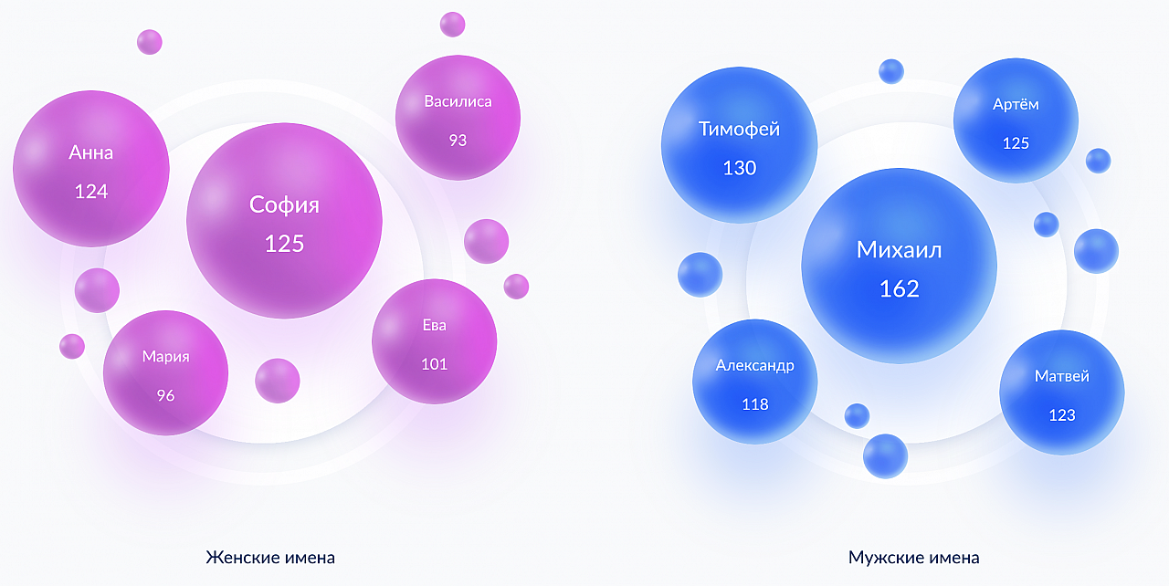 Среди женских имен самым популярным стало имя София, которым назвали 125 девочек. Почти столько же малышек получили имя Анна - 124 девочки. Часто встречались имена Ева, Мария и Василиса, их получили 101, 96 и 93 девочки соответственно.