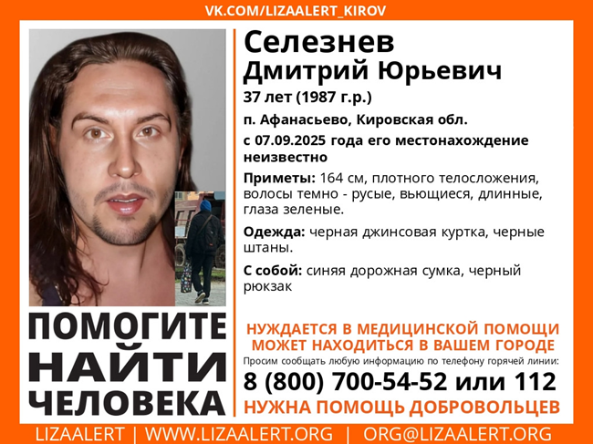 В пятницу, 10 октября, кировские волонтеры сообщили о продолжающихся поисках Дмитрия Юрьевича Селезнева. 37-летний житель поселка Афанасьево пропал еще в начале сентября 2025 года. С тех пор информации о местонахождении мужчины, нуждающегося в помощи медиков, нет. Известно, что он может находиться в Кирове.
