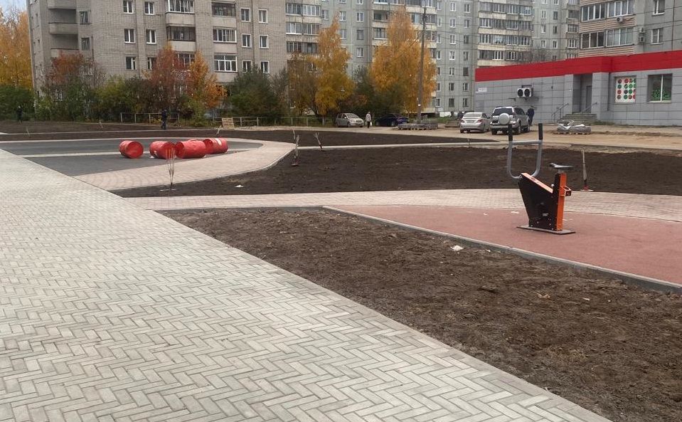 Компанией-подрядчиком созданы пешеходные дорожки и частично уложено резиновое покрытие на игровых площадках, проведены необходимые коммуникации для организации освещения. Также засыпаны участки для озеленения плодородной почвой с целью последующей высадки травы и других растений. Проходит монтаж и установка малых архитектурных форм.