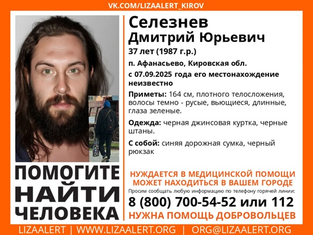 В Кировской области больше месяца ищут 37-летнего Дмитрия Селезнева. Мужчина пропал 7 сентября в поселке Афанасьево. По данным волонтеров, Дмитрий может находиться в Кирове. О ходе поисков рассказал брат пропавшего Максим.