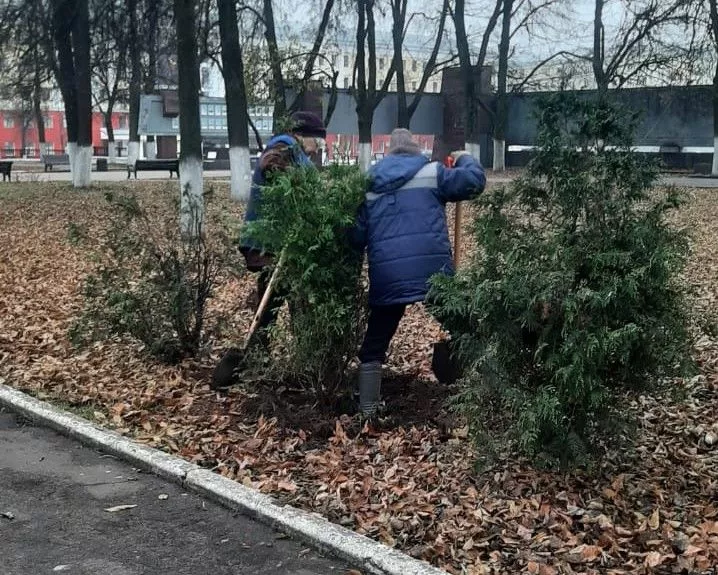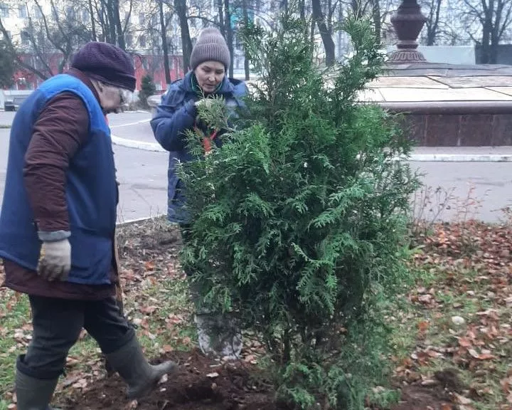 В сквере на Театральной площади специалисты занимаются посадкой новых растений, о чем сообщили в отделе зеленого строительства городской администрации. 24 октября 2025 года бригада озеленителей высаживает хвойные деревья туи и 60 кустов кизильника.