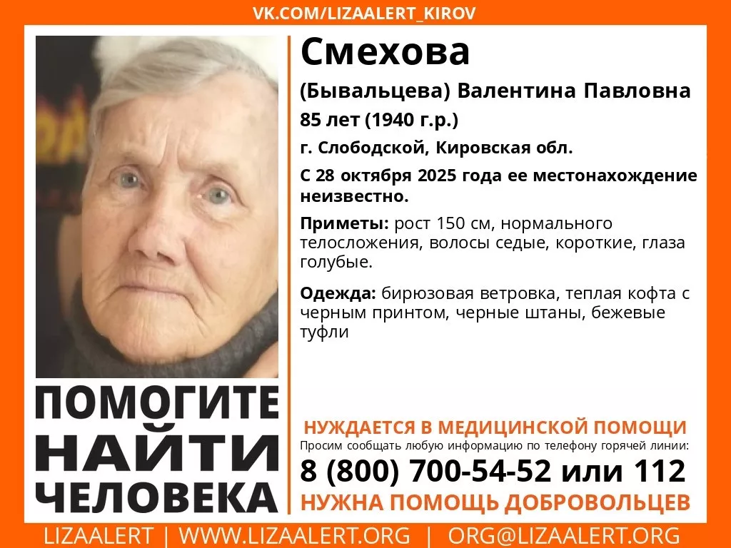 "Лиза Алерт" информирует о начале поисковой операции в связи с исчезновением 85-летней Валентины Смеховой (Бывальцевой). Место жительства пропавшей – город Слободской; последний раз ее видели 28 октября.