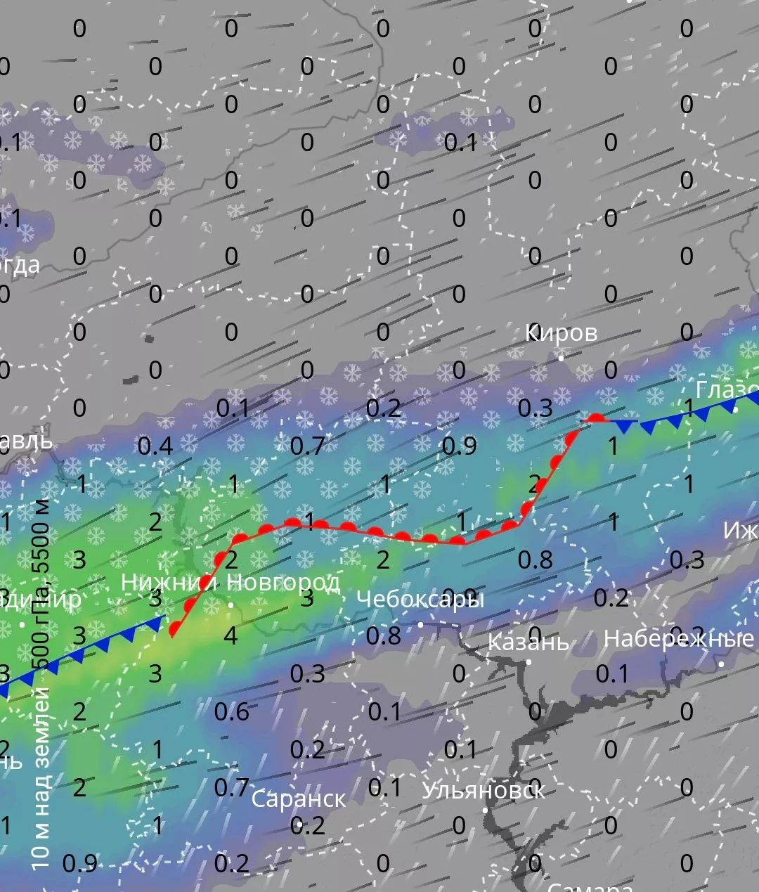 По расчетам немецкой модели ICON на холодном фронте появился участок теплого фронта или стадия волны, из которой далее начнет формироваться циклон. Летом бы получили интенсивные грозы, а сейчас обильные снегопады, - говорят метеорологи-любители.