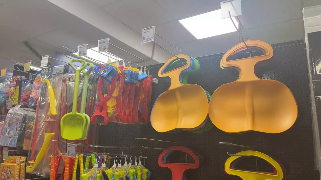 Зимой, конечно, не обойтись без ледянок и лопаток. Цена: 124 рубля за ледянки и 69 за лопату.