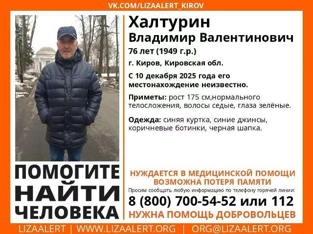 В городе Кирове разыскивается 76-летний Владимир Валентинович Халтурин. Об исчезновении мужчины заявили добровольцы поисково-спасательной группы "Лиза Алерт".