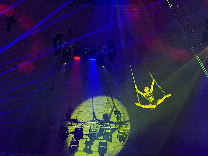 Новая цирковая программа богата не только экстремальными номерами. Мастерство элегантности и уверенности в каждом движении зрителям демонстрирует Ирина Душаканова. Воздушная гимнастка взмывает под купол цирка, грациозно паря в такт музыке и создавая завораживающие образы, словно оживающие в воздухе и наполняющие зал ощущением легкости и изящества.