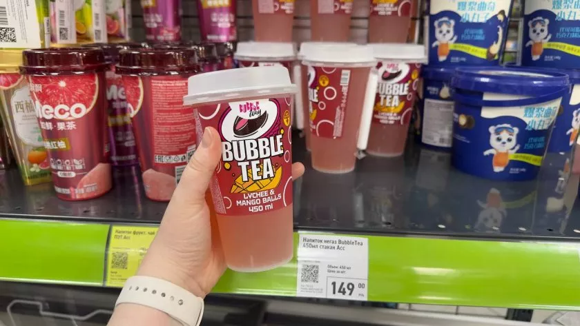 Первым в корзину отправился bubble tea с личи и манго. Для Fix Price вкус оказался неожиданно мягким и насыщенным, с легкой тропической сладостью.