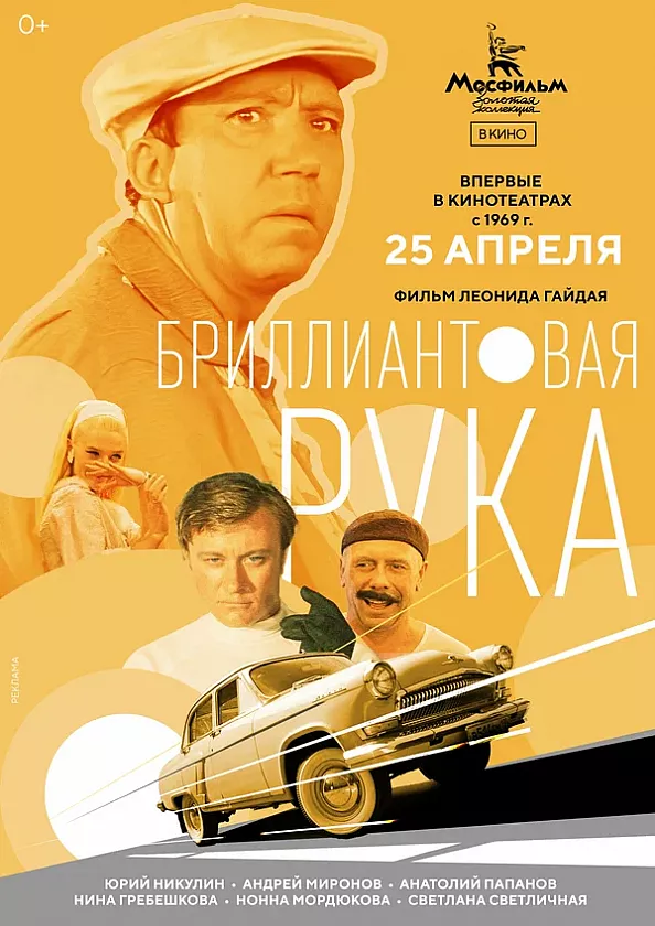 5. Бриллиантовая рука (18+) - В южном городе действует группа валютчиков под предводительством Шефа и его помощника Графа (известного также как Гена Козодоев). Простой советский служащий и примерный муж Семен Семенович Горбунков отправляется в зарубежный круиз на теплоходе, куда также направляется Граф. Его задача - получить бриллианты в одном из восточных городов и провезти их, загипсовав руку. Однако из-за недоразумения на условленном месте оказывается ничего не подозревающий Семен Семенович, и гипс накладывают ему.