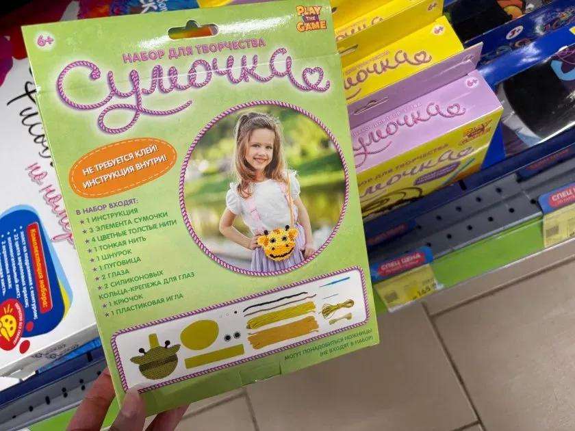 Для девочек есть замечательный набор для творчества - с ним можно самостоятельно сделать яркую сумку. И, что важно, клей не нужен - это большой плюс.