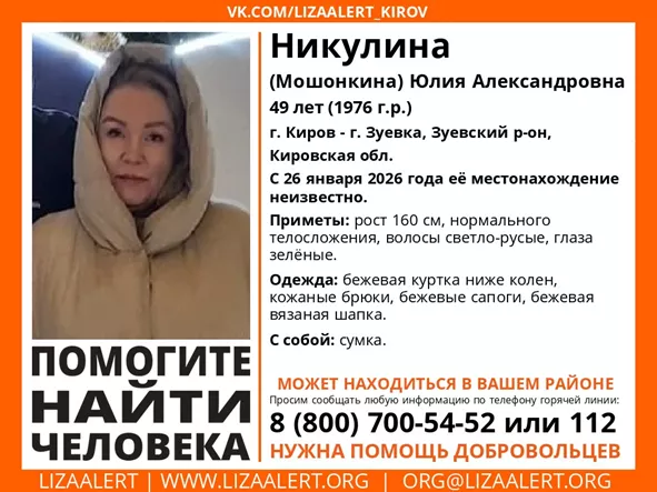 В понедельник, 2 февраля, кировские волонтеры начали поисковую операцию, целью которой является установление местонахождения Юлии Александровны Никулиной (Мошонкиной). Женщина 49 лет пропала еще в понедельник, 26 января. По данным "ЛизаАлерт", она может находиться в Кирове или в Зуевском районе, включая город.