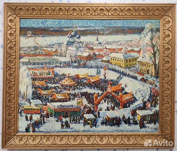 Автор публикации сообщил, что картина в стиле ретро. Размеры: 82 сантиметра в ширину и 65 сантиметров в высоту. Рамка выполнена вручную из дерева. На картине изображена ярмарка в овраге на Вятке. С обратной стороны есть подпись автора - Анатолия Николаевича Шабурова. Продавец отметил, что цена в два миллиона указана для привлечения внимания.