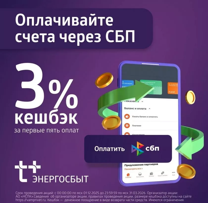 "ЭнергосбыТ Плюс" информирует клиентов о продолжении акции с кешбэком 3%, которая проходит с 1 декабря 2025 года по 31 марта 2026 года.