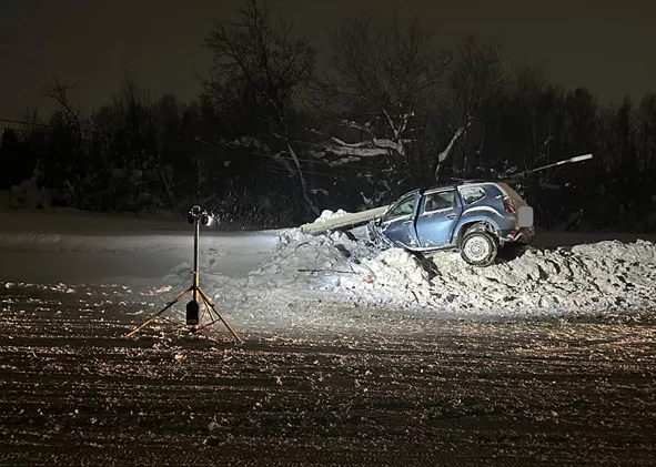 В субботу, 14 февраля, кировчане, ехавшие в Нововятск, стали свидетелями необычной картины: в сугробе на обочине стояла машина, на которую рухнул столб. Подбитая машина марки Renault Duster оставалась брошенной долгое время. Что случилось с ней и ее водителем, в Госавтоинспекции рассказали спустя два дня.