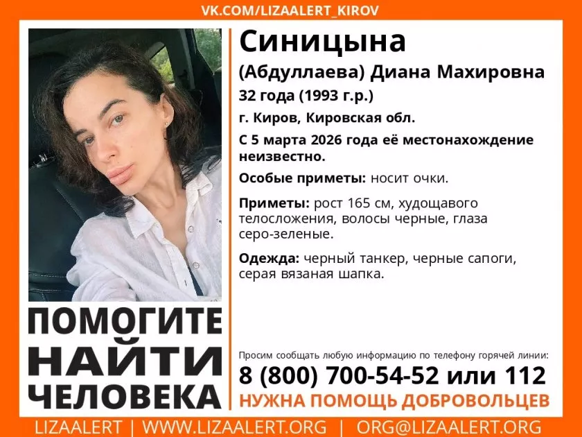В Кирове пропала 32-летняя Диана Махировна Синицына (Абдуллаева). С момента исчезновения, которое произошло 5 марта 2026 года, ее местонахождение остается неизвестным.